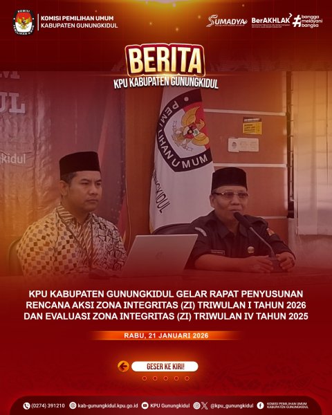 KPU Kabupaten Gunungkidul terus memperkuat komitmen dalam mewujudkan birokrasi yang bersih, akuntabel, dan melayani melalui penyelenggaraan Rapat Penyusunan Rencana Aksi Zona Integritas (ZI) Triwulan I Tahun 2026 dan Evaluasi Pelaksanaan Zona Integritas Triwulan IV Tahun 2025, yang dilaksanakan pada Rabu, 21 Januari 2026, bertempat di ruang rapat Kantor KPU Kabupaten Gunungkidul. Rapat ini bertujuan untuk melakukan evaluasi menyeluruh atas pelaksanaan program Zona Integritas pada Triwulan IV Tahun 2025, sekaligus menyusun rencana aksi yang strategis, terukur, dan berorientasi pada peningkatan kualitas pelayanan publik pada Triwulan I Tahun 2026. Evaluasi dilakukan terhadap capaian kinerja, efektivitas program, serta kendala yang dihadapi sebagai dasar perbaikan berkelanjutan. Ketua KPU Kabupaten Gunungkidul, Asih Nuryanti dalam arahannya menyampaikan bahwa pembangunan Zona Integritas merupakan komitmen bersama seluruh jajaran yang harus dilaksanakan secara konsisten dan berkesinambungan. Penguatan budaya kerja berintegritas, peningkatan kualitas layanan publik, serta inovasi pelayanan menjadi fokus utama dalam mendukung terwujudnya Wilayah Birokrasi Bersih dan Melayani (WBBM). Melalui kegiatan ini, KPU Kabupaten Gunungkidul menegaskan komitmennya untuk terus melakukan pembenahan internal dan peningkatan tata kelola kelembagaan guna menghadirkan pelayanan publik yang transparan, profesional, dan berintegritas. ....