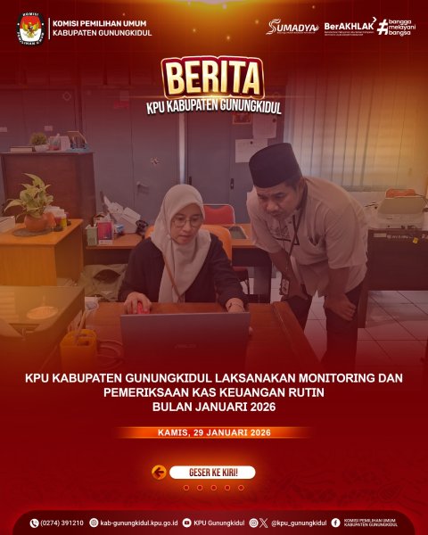 KPU Gunungkidul Lakukan Monitoring Kas oleh Divisi Hukum dan Pengawasan Komisi Pemilihan Umum (KPU) Kabupaten Gunungkidul melaksanakan kegiatan monitoring kas sebagai bagian dari upaya penguatan tata kelola keuangan yang transparan dan akuntabel. Kegiatan monitoring tersebut dilaksanakan oleh Ketua Divisi Hukum dan Pengawasan KPU Kabupaten Gunungkidul kepada Bendahara KPU Kabupaten Gunungkidul, Kamis (29/1). Monitoring kas ini bertujuan untuk memastikan kesesuaian antara pencatatan administrasi keuangan dengan kondisi kas secara riil, sekaligus sebagai langkah pengawasan internal terhadap pengelolaan keuangan lembaga. Dalam kegiatan tersebut, dilakukan pemeriksaan terhadap buku kas, bukti transaksi, serta kecukupan administrasi pendukung lainnya. Ketua Divisi Hukum dan Pengawasan KPU Kabupaten Gunungkidul menyampaikan bahwa monitoring kas merupakan bagian dari pelaksanaan fungsi pengawasan internal guna mencegah potensi penyimpangan serta memastikan pengelolaan keuangan berjalan sesuai dengan ketentuan peraturan perundang-undangan yang berlaku. “Monitoring kas ini penting untuk menjaga akuntabilitas dan transparansi pengelolaan keuangan di lingkungan KPU Kabupaten Gunungkidul, serta sebagai bentuk komitmen kami dalam mewujudkan tata kelola yang baik,” ujarnya. Sementara itu, Bendahara KPU Kabupaten Gunungkidul menyambut baik pelaksanaan monitoring kas tersebut dan menyampaikan kesiapan untuk terus meningkatkan tertib administrasi serta kepatuhan dalam pengelolaan keuangan. KPU Kabupaten Gunungkidul berkomitmen untuk terus melaksanakan pengawasan internal secara berkala sebagai bagian dari upaya memperkuat integritas lembaga dan mendukung terwujudnya Zona Integritas menuju Wilayah Bebas dari Korupsi (WBK). ....