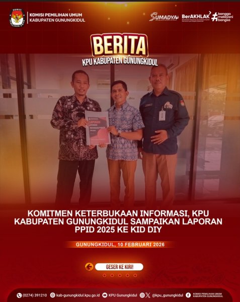 Selasa (10/02), Komisi Pemilihan Umum Kabupaten Gunungkidul menyampaikan Laporan Pengelolaan PPID Tahun 2025 kepada Komisi Informasi Daerah (KID) Daerah Istimewa Yogyakarta. Penyampaian laporan tersebut dilaksanakan secara langsung oleh Sudarmanto selaku Ketua Divisi Sosialisasi, Pendidikan Pemilih, Partisipasi Masyarakat dan SDM serta Sugito selaku Kepala Subbagian yang membidangi Parhumas dan SDM. Laporan diterima oleh Bapak Aswino selaku Anggota Komisi Informasi Daerah DIY. Dalam kesempatan tersebut, KPU Gunungkidul menyerahkan dokumen laporan sebagai bentuk pertanggungjawaban pelaksanaan keterbukaan informasi publik sepanjang Tahun 2025. Laporan ini memuat berbagai aspek pengelolaan informasi, mulai dari pelayanan permohonan informasi, penyediaan informasi publik, hingga upaya peningkatan kualitas layanan PPID. Ketua Divisi Sosdiklih, Parmas dan SDM KPU Gunungkidul Sudarmanto, menyampaikan bahwa penyampaian laporan ini merupakan bagian dari komitmen KPU Gunungkidul dalam mewujudkan penyelenggaraan pemilu yang transparan dan akuntabel, sekaligus sebagai bentuk kepatuhan terhadap regulasi keterbukaan informasi publik. Sebagai bentuk apresiasi atas kinerja pengelolaan informasi publik, KPU Kabupaten Gunungkidul dalam Penilaian KID Tahun 2025 berhasil meraih Predikat Informatif dengan nilai 94,75% serta memperoleh penghargaan PPID berprestasi. Capaian ini menjadi motivasi bagi KPU Kabupaten Gunungkidul untuk terus meningkatkan kualitas layanan informasi kepada masyarakat. Sementara itu, pihak KID DIY mengapresiasi langkah KPU Kabupaten Gunungkidul yang secara konsisten melaporkan pengelolaan PPID setiap tahun. Diharapkan ke depan pelayanan informasi publik di lingkungan KPU Kabupaten Gunungkidul dapat terus ditingkatkan, sehingga masyarakat semakin mudah memperoleh akses informasi kepemiluan. Melalui kegiatan ini, KPU Kabupaten Gunungkidul menegaskan komitmennya untuk terus memperkuat tata kelola informasi publik sebagai bagian dari upaya membangun kepercayaan masyarakat terhadap lembaga penyelenggara pemilu. ....