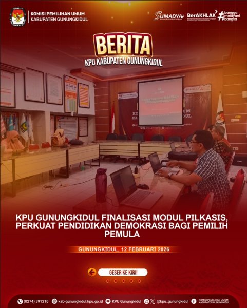 Wonosari, 12 Februari 2026 — Komisi Pemilihan Umum (KPU) Kabupaten Gunungkidul melaksanakan kegiatan Finalisasi Modul Pemilihan Ketua OSIS (PILKASIS) bertempat di Ruang Rapat KPU Kabupaten Gunungkidul. Kegiatan ini diikuti oleh Ketua dan Anggota KPU Kabupaten Gunungkidul, Sekretaris, Kepala Subbagian, pejabat fungsional, serta staf Subbag Partisipasi Hubungan Masyarakat dan SDM. Kegiatan diawali dengan pemaparan draft Buku Panduan PILKASIS oleh Subbag Parhumas dan SDM yang memuat latar belakang, tujuan, tahapan pelaksanaan, struktur penyelenggara, mekanisme pencalonan, kampanye, pemungutan dan penghitungan suara, hingga evaluasi pelaksanaan kegiatan. Finalisasi modul ini bertujuan untuk menyiapkan bahan pendidikan pemilih pemula yang aplikatif di lingkungan sekolah, sekaligus menjadi media pembelajaran demokrasi bagi pelajar melalui simulasi proses Pemilu. Pada akhir kegiatan, Ketua KPU Kabupaten Gunungkidul menyampaikan arahan bahwa penyusunan Modul PILKASIS merupakan bagian dari upaya strategis KPU dalam melaksanakan pendidikan pemilih berkelanjutan. Modul ini diharapkan dapat menjadi sarana pembelajaran demokrasi yang efektif serta menanamkan nilai integritas, sportivitas, dan partisipasi aktif sejak dini. Sebagai hasil kegiatan, Modul PILKASIS akan disempurnakan dan selanjutnya digunakan sebagai pedoman pelaksanaan PILKASIS di sekolah/madrasah sasaran. Ke depan, KPU Kabupaten Gunungkidul juga merencanakan kegiatan pendampingan melalui Training of Trainers (ToT) sebagai penguatan implementasi program. ....