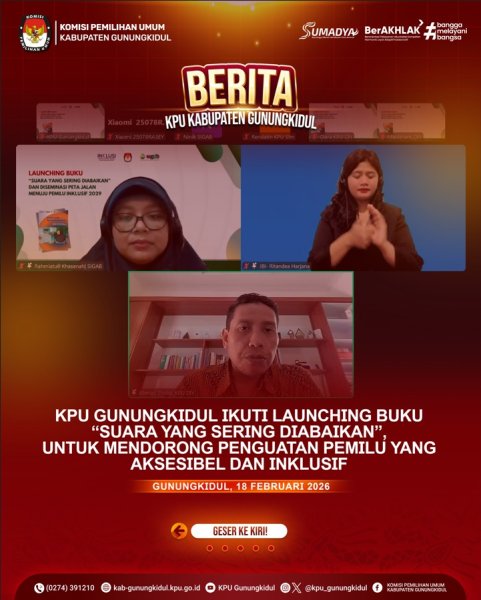 Wonosari (18/02/2026), Komisi Pemilihan Umum Kabupaten Gunungkidul mengikuti kegiatan launching buku Suara yang Sering Diabaikan: Analisis Inklusivitas Pemilu 2024 bagi Difabel dan Diseminasi Peta Jalan Menuju Pemilu Inklusif 2029 yang diselenggarakan secara daring melalui platform Zoom. Kegiatan ini menjadi ruang refleksi pasca Pemilu 2024 untuk mendorong pemenuhan hak politik penyandang disabilitas sekaligus menghadirkan rekomendasi strategis menuju sistem pemilu yang lebih inklusif dan berkeadilan pada tahun 2029. Acara tersebut merupakan hasil kolaborasi antara SIGAB Indonesia dan KPU Daerah Istimewa Yogyakarta. Peserta dari KPU Kabupaten Gunungkidul terdiri atas Ketua beserta Anggota KPU, Sekretaris, serta Pejabat Struktural di lingkungan Sekretariat KPU Kabupaten Gunungkidul. sebelum memasuki acara inti, Ketua KPU DIY, Ahmad Shidqi memberikan sambutan terkait tentang perlunya kerja keras untuk dapat meningkatkan partisipasi dari teman-teman penyandang Disabilitas. selanjutnya dalam Launching buku menghadirkan narasumber Slamet Thohari selaku Tim Penulis, Suharto, serta Sri Surani. Diskusi dipandu oleh moderator Ninik Heca. Dalam pemaparannya, Slamet Thohari menyampaikan hasil survei persepsi pemilih difabel serta pemantauan tempat pemungutan suara (TPS) di berbagai daerah yang menunjukkan masih adanya hambatan signifikan bagi pemilih penyandang disabilitas. Hambatan tersebut meliputi keterbatasan akses fisik TPS, minimnya fasilitas braille, kurangnya informasi yang ramah difabel, hingga masih rendahnya perhatian isu disabilitas dalam visi dan misi kandidat. Selain itu, stigma sosial dan hambatan administratif juga dinilai turut membatasi partisipasi politik penyandang disabilitas. Sementara itu, Suharto dari SIGAB Indonesia menekankan pentingnya advokasi pemilu aksesibel sebagai bagian dari pemenuhan hak konstitusional warga negara. Ia memaparkan strategi advokasi kepada pemerintah, penyelenggara pemilu, partai politik, serta komunitas difabel, antara lain melalui penguatan regulasi inklusif, penyediaan standar aksesibilitas TPS, peningkatan kapasitas petugas KPPS, penyediaan informasi dalam berbagai format aksesibel, serta penguatan mekanisme pengaduan yang mudah dijangkau oleh penyandang disabilitas. Pada sesi berikutnya, Sri Surani dari KPU DIY memaparkan peta jalan menuju Pemilu Inklusif 2029 yang disusun berbasis kolaborasi multipihak. Peta jalan tersebut memuat lima pilar strategis, yakni pendataan pemilih berperspektif disabilitas, penguatan sosialisasi dan pendidikan pemilih, peningkatan aksesibilitas TPS dan logistik, penguatan layanan pemungutan suara, serta mekanisme pengawasan dan pengaduan yang responsif terhadap kebutuhan penyandang disabilitas. Peta jalan ini juga merinci langkah implementasi bertahap mulai dari fase fondasi, implementasi, hingga penguatan dan inovasi, dengan sasaran antara lain tersedianya data pemilih disabilitas yang akurat, materi pendidikan pemilih yang aksesibel, TPS ramah difabel, layanan pendampingan yang menjamin kerahasiaan suara, serta pelibatan aktif organisasi penyandang disabilitas dalam seluruh tahapan pemilu. Melalui kegiatan ini, KPU Kabupaten Gunungkidul berharap memperoleh wawasan sebagai bahan evaluasi serta penguatan program sosialisasi dan pendidikan pemilih, khususnya bagi penyandang disabilitas, sekaligus memperkuat komitmen menghadirkan proses demokrasi yang partisipatif, aksesibel, dan berkeadilan menuju Pemilu 2029. ....