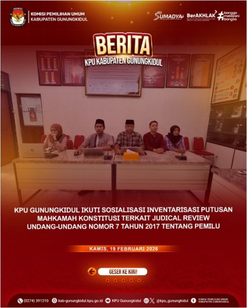 KPU Gunungkidul mengikuti Sosialisasi Inventarisasi Putusan Mahkamah Konstitusi terkait Judicial Review Undang-Undang Nomor 7 Tahun 2017 tentang Pemilu yang diselenggarakan oleh KPU DIY pada Kamis, 19 Februari 2026. Kegiatan ini diikuti oleh Ketua Divisi Teknis dan Penyelenggaraan, Ketua Divisi Hukum dan Pengawasan, Kepala Sub Bagian, serta Pelaksana Teknis Penyelenggaraan Pemilu dan Hukum sebagai bentuk penguatan kapasitas dan pemahaman terhadap dinamika regulasi kepemiluan. Komitmen kami: memastikan setiap tahapan pemilu berjalan sesuai konstitusi, regulasi, dan prinsip demokrasi yang berintegritas. ....