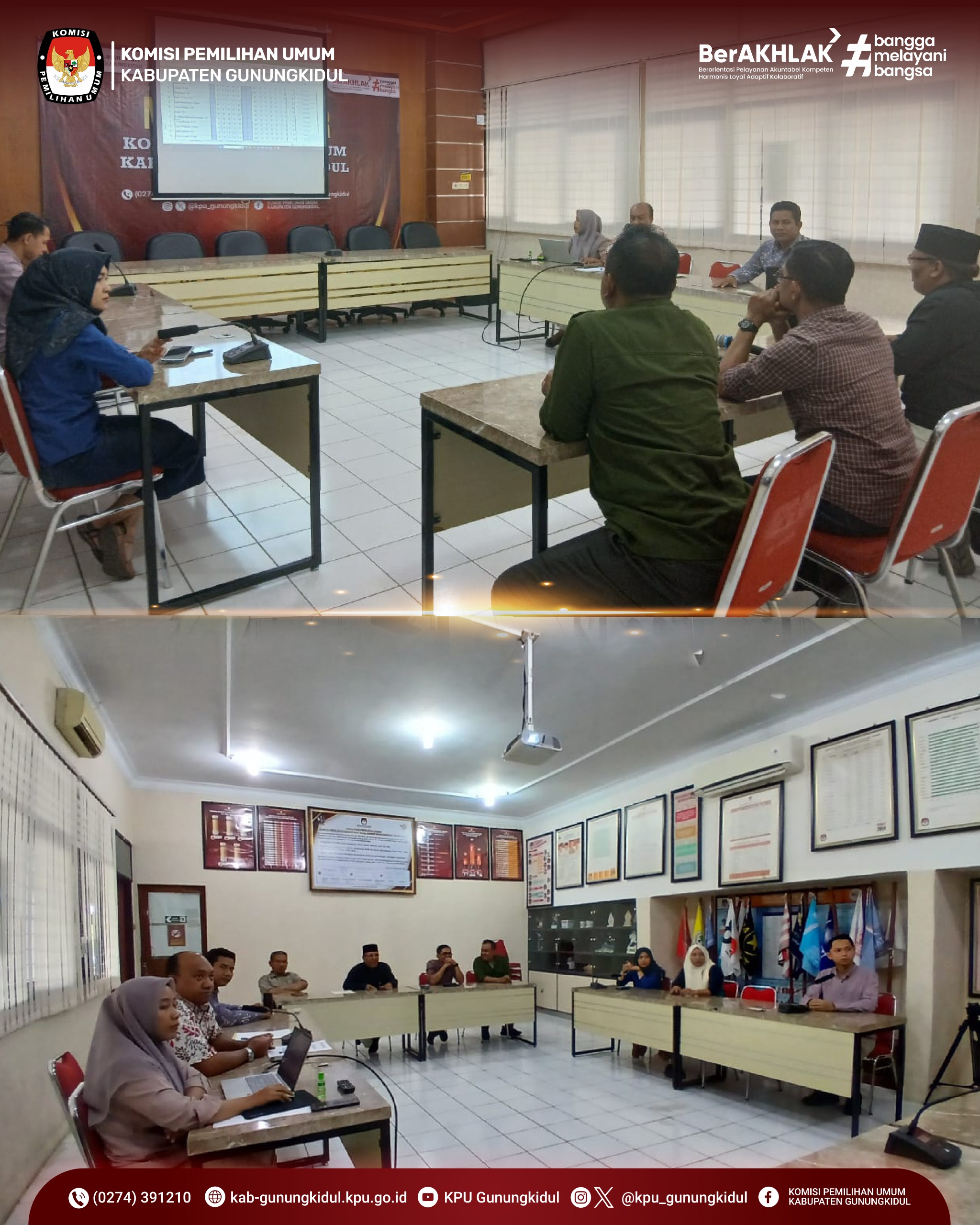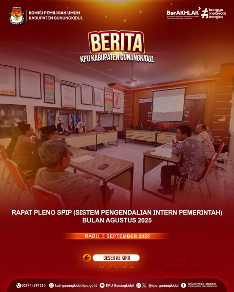 Rabu (3/9/2025), KPU kabupaten Gunungkidul menggelar Rapat Pleno SPIP (Sistem Pengendalian Intern Pemerintah) Bulan Agustus 2025. Rapat ini dilaksanakan di ruang rapat KPU Kabupaten Gunungkidul dan dihadiri oleh Ketua dan anggota KPU Kabupaten Gunungkidul, Sekretaris KPU Kabupaten Gunungkidul, Pejabat Struktural dan Fungsional KPU kabupaten Gunungkidul, dan Staf Hukum. Rapat ini dipimpin oleh Sekretaris KPU kabupaten Gunungkidul, Totok Singgih.