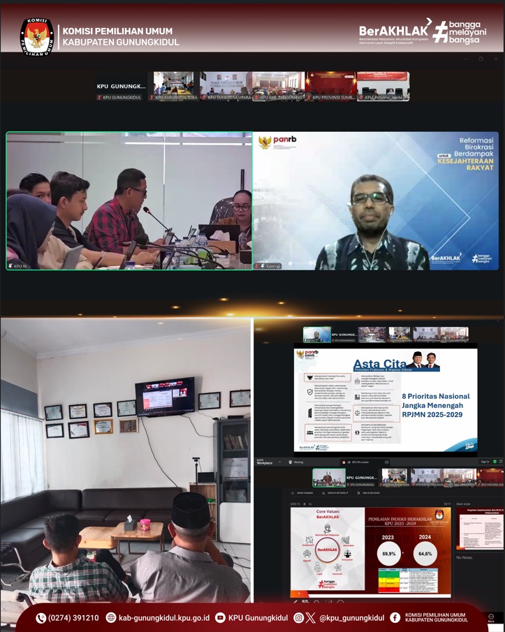 Komisi Pemilihan Umum (KPU) Kabupaten Gunungkidul mengikuti kegiatan Knowledge Sharing dengan tema Implementasi Budaya Kerja ASN BerAKHLAK yang digelar oleh KPU Republik Indonesia pada Kamis (25/09/2025) secara daring melalui aplikasi Zoom Meeting.