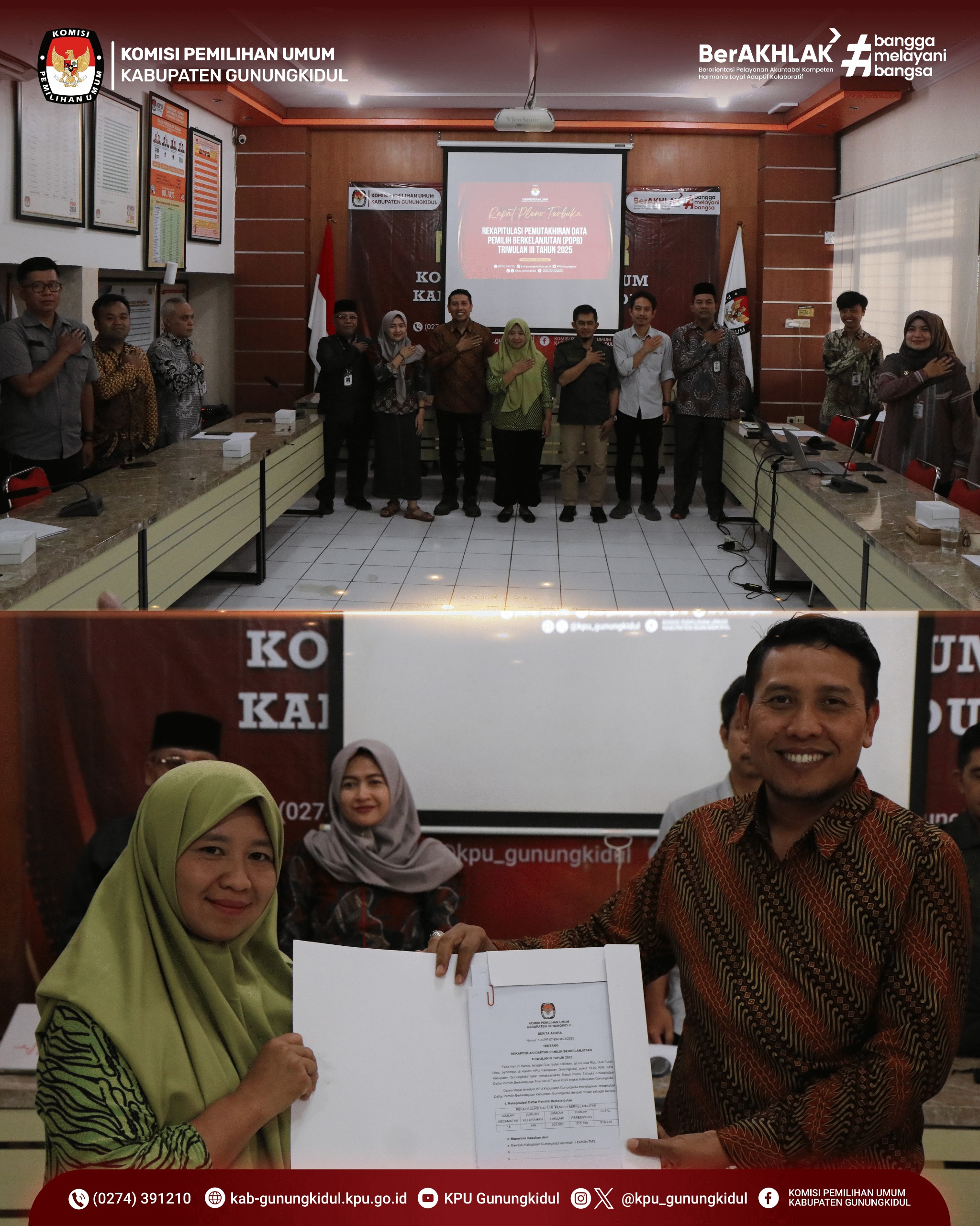 Komisi Pemilihan Umum (KPU) Kabupaten Gunungkidul menggelar Rapat Pleno Rekapitulasi Daftar Pemilih Berkelanjutan (PDPB) Triwulan III Tahun 2025 pada hari Kamis, 2 Oktober 2025 pukul 13.00 WIB, bertempat di ruang rapat KPU Kabupaten Gunungkidul.