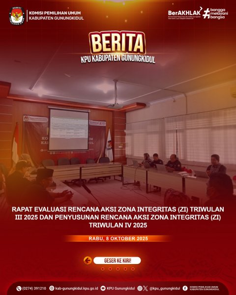 Rabu (8/10/2025), Komisi Pemilihan Umum (KPU) Kabupaten Gunungkidul menggelar Rapat Evaluasi Rencana Aksi Zona Integritas (ZI) Triwulan III Tahun 2025 sekaligus penyusunan Rencana Aksi ZI Triwulan IV Tahun 2025, sebagai bagian dari komitmen menuju terwujudnya Zona Integritas di lingkungan KPU Kabupaten Gunungkidul.