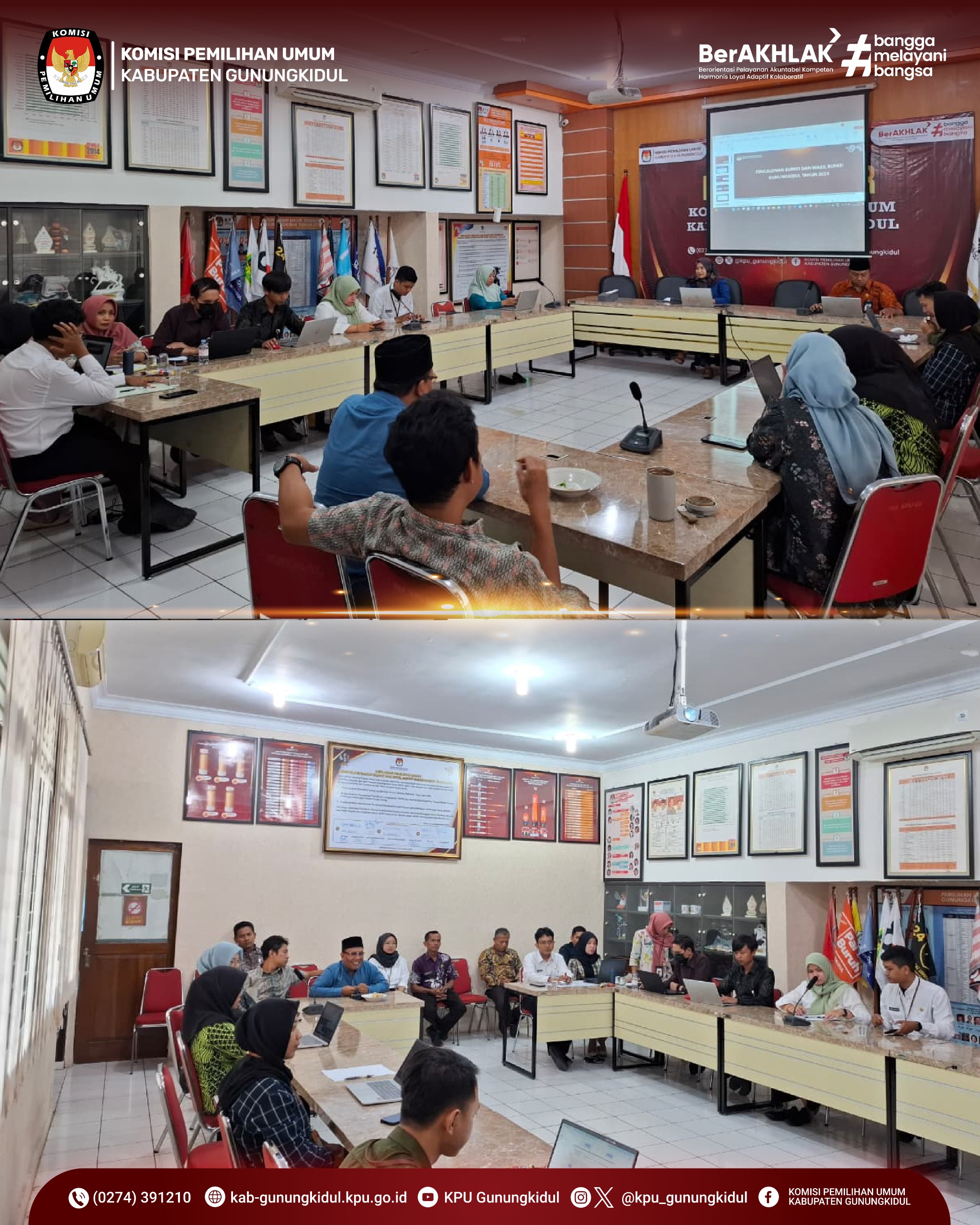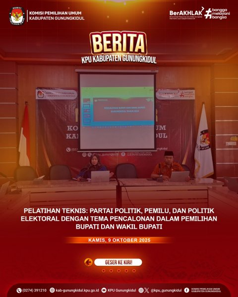 Kamis (9/10/2025), Komisi Pemilihan Umum (KPU) Kabupaten Gunungkidul menyelenggarakan kegiatan Pelatihan Teknis Partai Politik, Pemilu, dan Politik Elektoral dengan tema Pencalonan Dalam Pemilihan Bupati dan Wakil Bupati. Kegiatan ini berlangsung di Ruang Rapat KPU Kabupaten Gunungkidul dan dihadiri oleh Ketua dan Anggota KPU Kabupaten Gunungkidul, Sekretaris KPU, para Pejabat Struktural dan Fungsional, serta ASN dan Non Asn di lingkungan KPU Kabupaten Gunungkidul. Narasumber dalam pelatihan teknis ini, yaitu Supami selaku Ketua Divisi Teknis Penyelenggaraan.