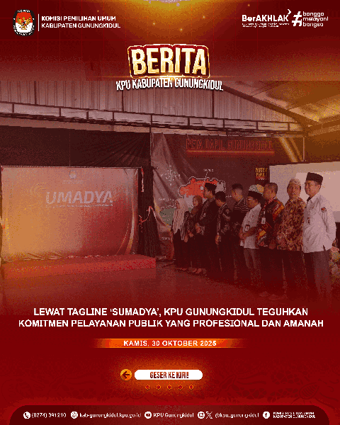 Wonosari, 30 Oktober 2025 — Komisi Pemilihan Umum (KPU) Kabupaten Gunungkidul resmi meluncurkan Tagline Budaya Kerja “SUMADYA”, sebagai simbol komitmen bersama untuk mewujudkan aparatur yang berintegritas, profesional, dan berjiwa pelayanan.
