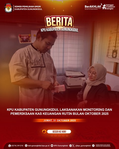 Komisi Pemilihan Umum (KPU) Kabupaten Gunungkidul melaksanakan kegiatan Monitoring dan Pemeriksaan Kas Keuangan rutin untuk periode bulan Oktober Tahun 2025