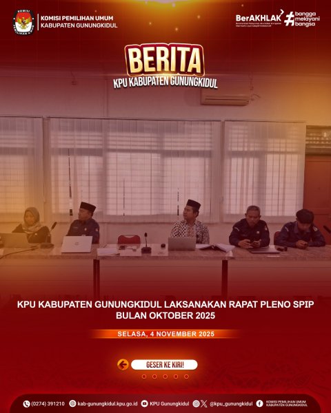Komisi Pemilihan Umum (KPU) Kabupaten Gunungkidul melaksanakan Rapat Pleno Bulan Oktober 2025 pada Selasa (4/11/2025) di Kantor KPU Kab. Gunungkidul. Kegiatan ini merupakan tindak lanjut dari Peraturan KPU Nomor 8 Tahun 2023 tentang Penyelenggaraan Sistem Pengendalian Intern Pemerintah di KPU, KPU Provinsi, dan KPU Kabupaten/Kota serta Keputusan KPU No. 855 Tahun 2025 tentang Pedoman Teknis Penyelenggaraan Sistem Pengendalian Intern Pemerintah di KPU, KPU Provinsi, dan KPU Kabupaten/Kota. Kegiatan diihadiri oleh Ketua dan anggota KPU Kabupaten Gunungkidul, Sekretaris, Pejabat Struktural dan Fungsional serta Staf Sub Bagian Hukum Sekretariat KPU Kab. Gunungkidul.