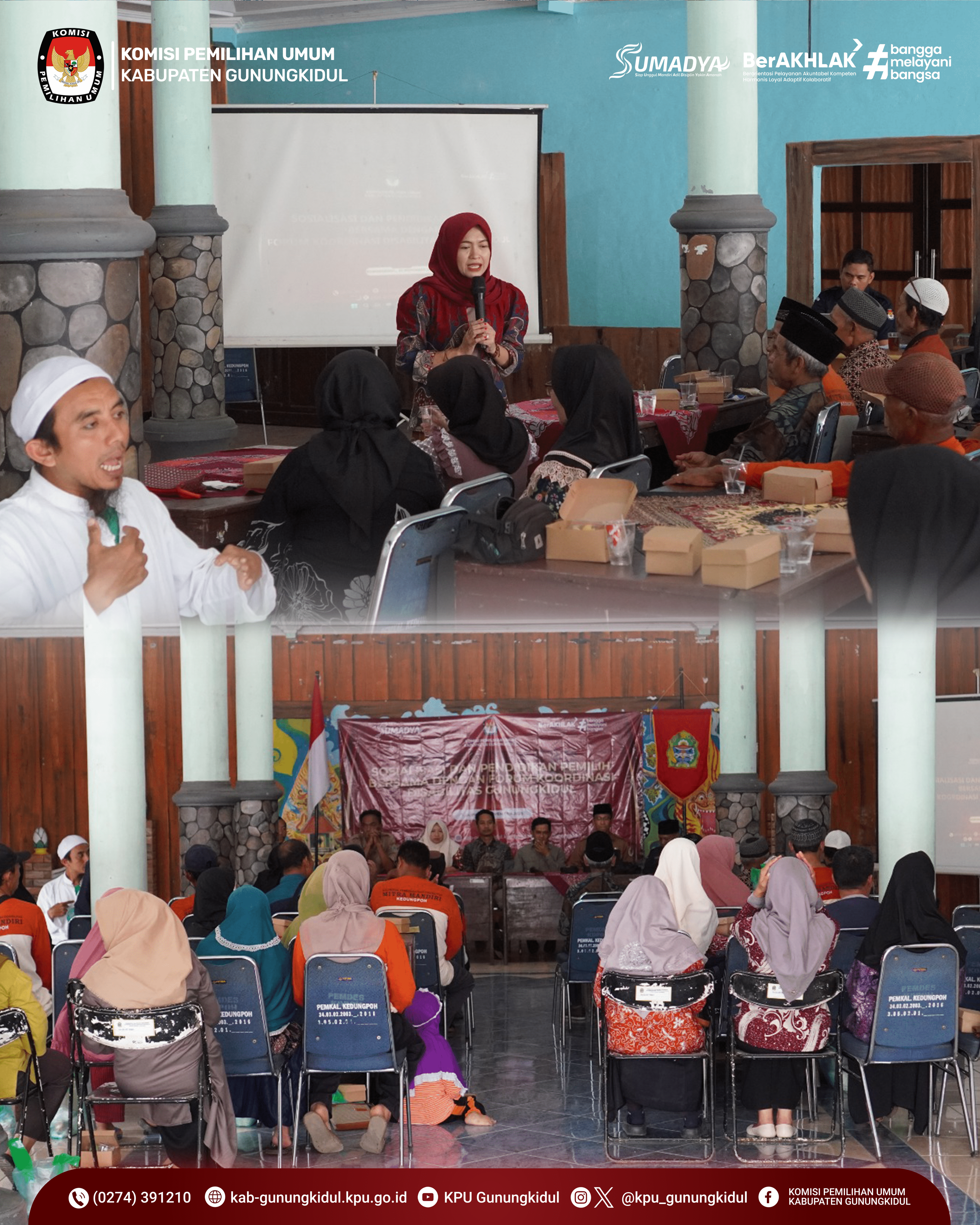 Komisi Pemilihan Umum (KPU) Kabupaten Gunungkidul bersama Forum Koordinasi Disabilitas Gunungkidul (FKDG) menggelar kegiatan Sosialisasi dan Pendidikan Pemilih bagi Penyandang Disabilitas di Balai Kalurahan Kedungpoh, Kapanewon Nglipar. Kegiatan ini berlangsung dari pukul 09.00 hingga 15.00 WIB dan diikuti oleh peserta penyandang disabilitas dari berbagai wilayah di Gunungkidul.