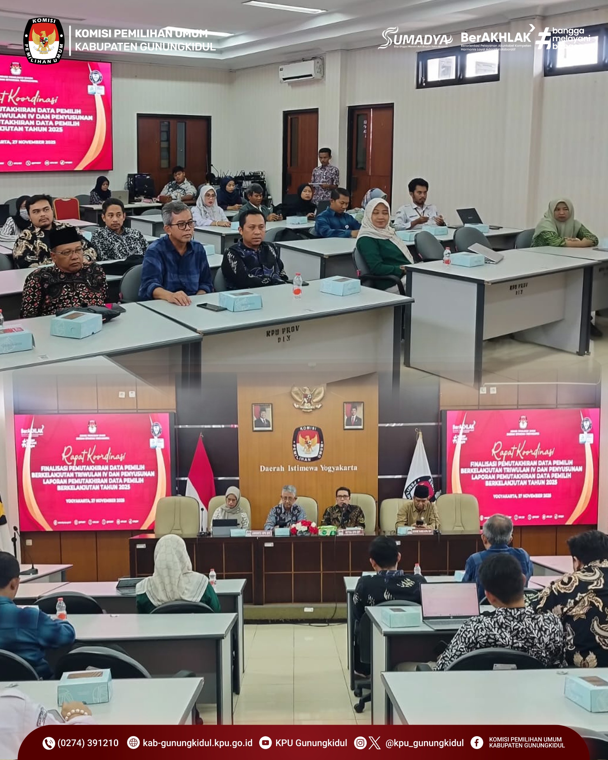 Kamis, 27/11/2025 bertempat di ruang rapat utama kantor KPU D.I. Yogyakarta, KPU Kabupaten Gunungkidul turut hadir dalam Rapat Koordinasi Finalisasi Pemutakhiran Data Pemilih Berkelanjutan (PDPB) Triwulan IV Tahun 2025. Selain membahas tentang progres eksekusi data yang diterima KPU Kabupaten Gunungkidul dari Kemendagri melalui KPU RI serta melaporkan hasil pelaksanaan kegiatan pencocokan terbatas (Coktas), dalam Rapat Koordinasi ini juga membahas terkait proses Penyusunan Laporan PDPB Tahun 2025 yang telah dilaksanakan oleh KPU Kabupaten Gunungkidul mulai dari Triwulan I, II, III dan IV Tahun 2025.
