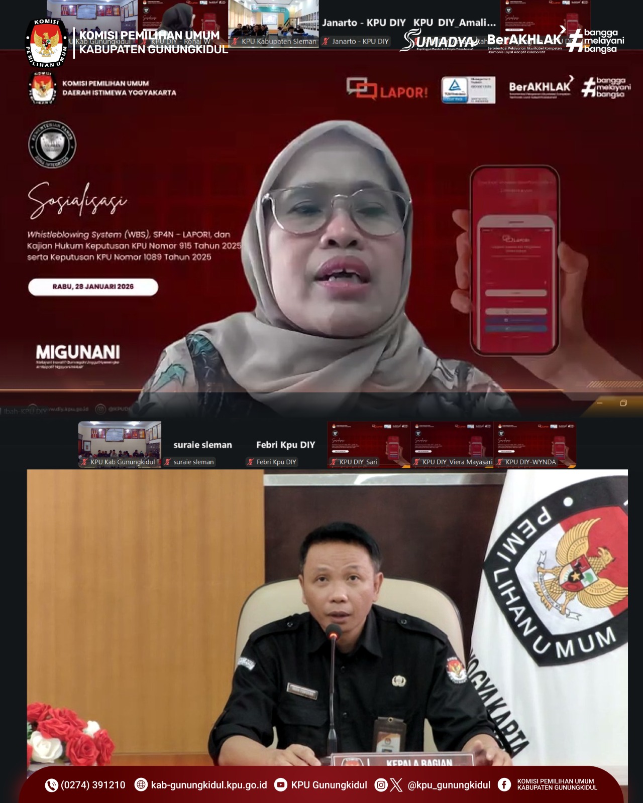 Komisi Pemilihan Umum (KPU) Kabupaten Gunungkidul mengikuti kegiatan Sosialisasi Whistleblowing System (WBS), Sistem Pengelolaan Pengaduan Pelayanan Publik Nasional – Layanan Aspirasi dan Pengaduan Online Rakyat (SP4N-LAPOR) serta Kajian Hukum Keputusan KPU Nomor 915 Tahun 2025 dan Keputusan KPU Nomor 1089 Tahun 2025 yang diselenggarakan oleh KPU Daerah Istimewa Yogyakarta (DIY), Rabu (28/1/2026). Kegiatan tersebut dilaksanakan secara daring melalui Zoom Meeting.