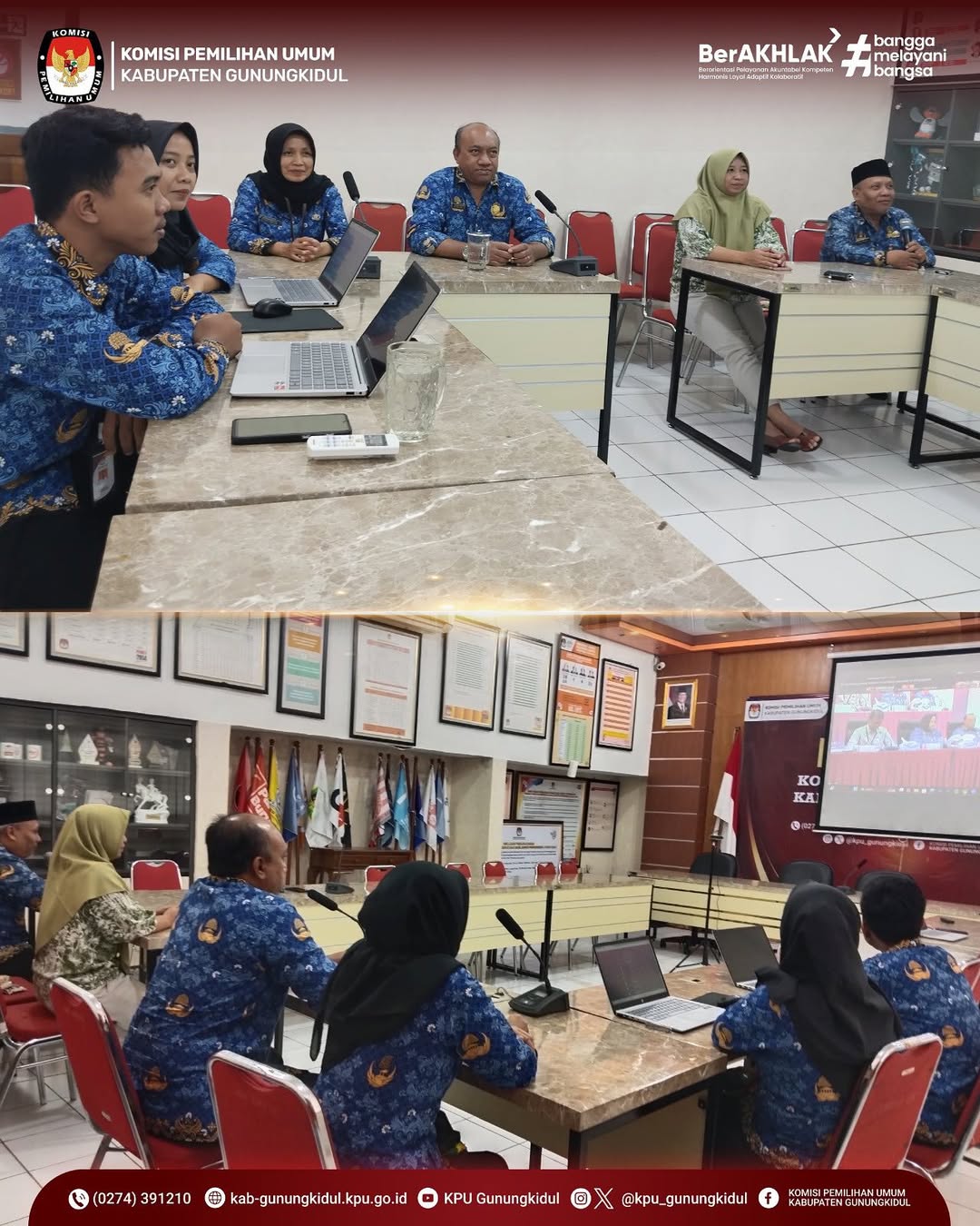 Kamis (17/7/2025) KPU Kab. Gunungkidul mengikuti Rapat Koordinasi Bimbingan Teknis (Bimtek) Pengisian Kertas Kerja Pelaksanaan Penilaian Mandiri Maturitas Penyelenggaraan Sistem Pengendalian Intern Pemerintah (SPIP) Terintegrasi Tahun 2025 yang diselenggarakan oleh KPU RI. Kegiatan ini bertujuan untuk meningkatkan kualitas dan integritas penyelenggaraan pemilu melalui penerapan SPIP yang lebih efektif dan efisien. Dalam rapat ini, dihadiri oleh Ketua KPU Kab. Gunungkidul, Ketua Divisi Hukum dan Pengawasan, Sekretaris, Kasubbag Hukum dan Teknis Pemilu, dan Staf Pelaksana Hukum dan Teknis Pemilu.
