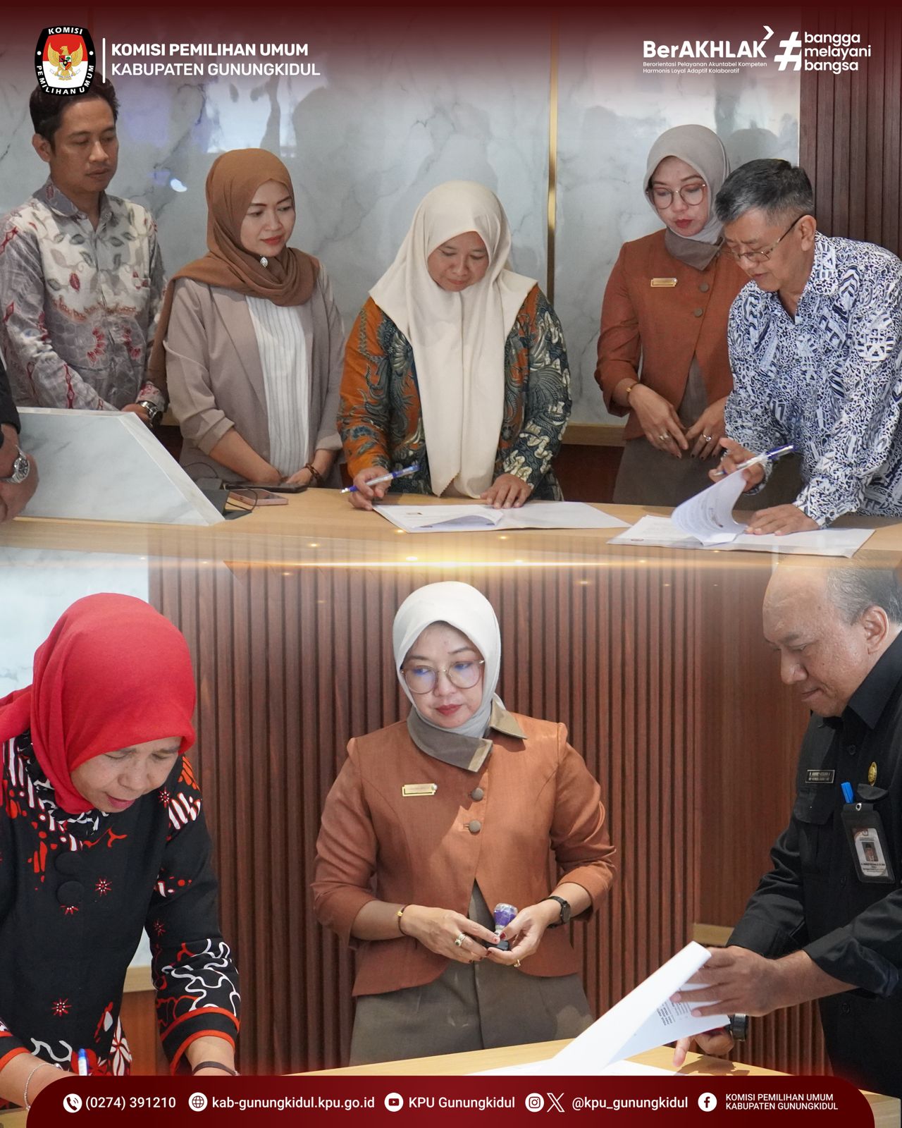 Rabu, (16/7/2025) KPU Kab. Gunungkidul melakukan Penandatanganan Memorandum of Understanding (MoU) dengan Universitas Gunungkidul (UGK) dalam rangka meningkatkan kualitas dan integritas penyelenggaraan pemilu. Dalam penandatanganan MoU tersebut, hadir Asih Nuryanti selaku Ketua Kab. Gunungkidul, Supami dan Irwan Budi Susanto selaku anggota Kab. Gunungkidul, Totok Singgih selaku Sekretaris KPU Kab. Gunungkidul, dan Andrey Kesuma selaku Kasubbag Teknis Penyelenggaraan Pemilu, Partisipasi, dan Hubungan Masyarakat. Dari pihak Universitas Gunungkidul (UGK) diwakili oleh Dr. Sugiyanto, S.Sos., M.M. selaku Rektor, Dr. Catarina Wahyu Dyah Purbaningrum, S.E., M.Pd. selaku Wakil Rektor I, dan Dra. Nurdiana Tri Mulatsih, M.Si. selaku Wakil Rektor II.