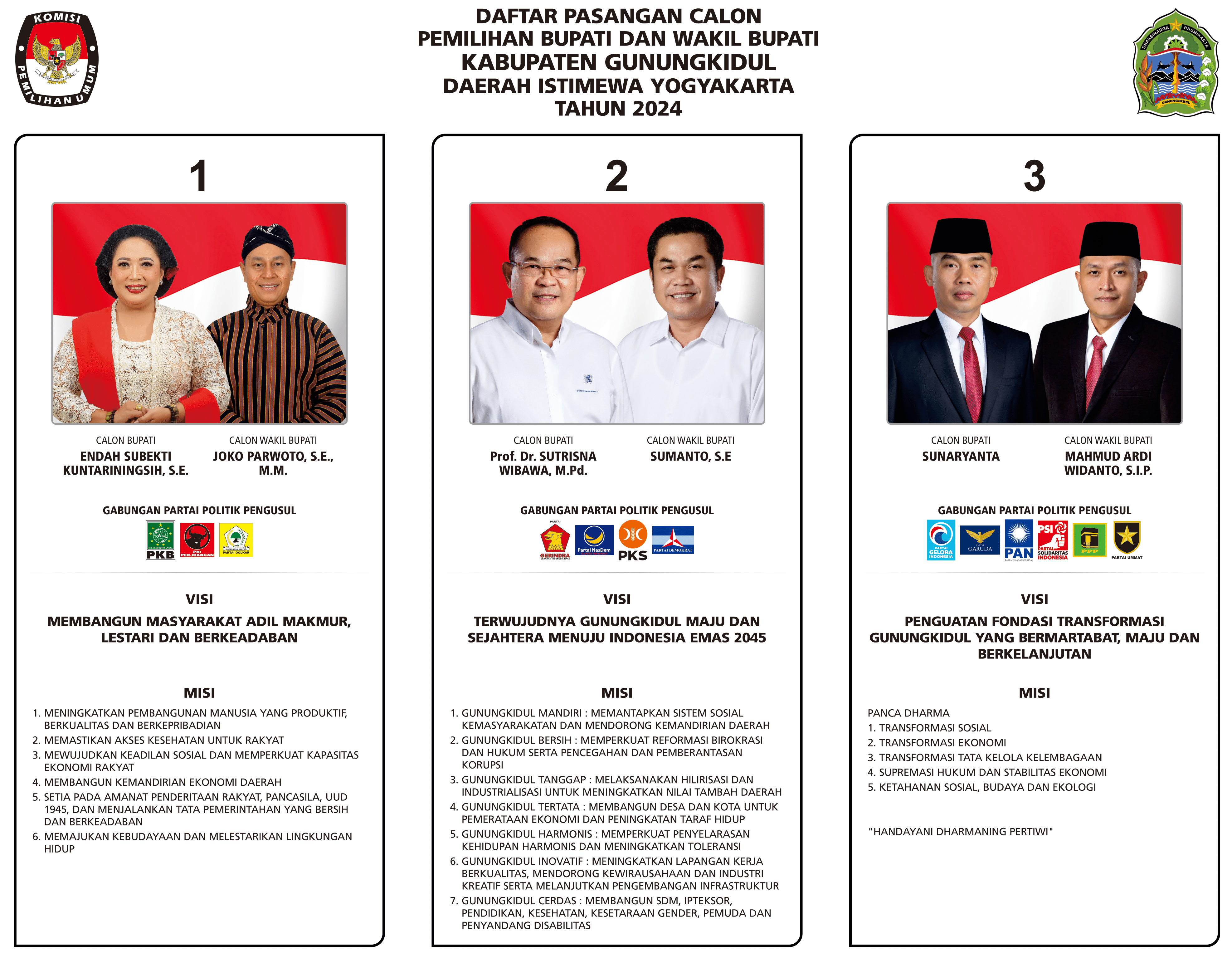 PENGUMUMAN NOMOR : 852/PL.02.2-PU/3403/2024 TENTANG DAFTAR PASANGAN CALON BUPATI DAN WAKIL BUPATI GUNUNGKIDUL DALAM PEMILIHAN SERENTAK TAHUN 2024
