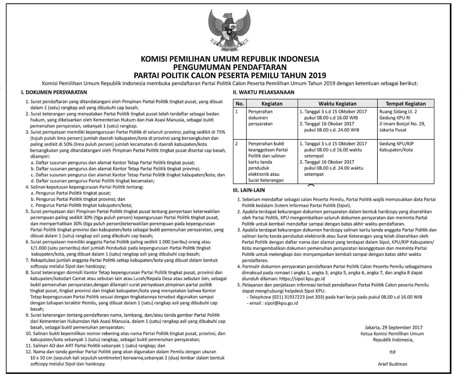 Pengumuman Pendaftaran Partai Politik Calon Peserta Pemilu Tahun 2019 [PERBESAR]