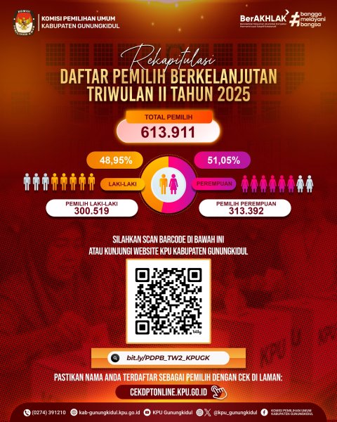 KPU Kabupaten Gunungkidul telah melaksanakan Rapat Pleno Terbuka Pemutakhiran Data Pemilih Berkelanjutan (PDPB) bertempat di Ruang Rapat Kantor KPU Kabupaten Gunungkidul pada hari Rabu, 2 Juli 2025. Adapun hasil rekapitulasi Pemutakhiran Data Pemilih Berkelanjutan (PDPB) Triwulan II Tahun 2025 Kabupaten Gunungkidul dengan rincian Data sebagai berikut: jumlah Pemilih Laki-laki 300.519, jumlah pemilih Perempuan 313.392 dengan Jumlah total Keseluruhan adalah 613.911 Pemilih.