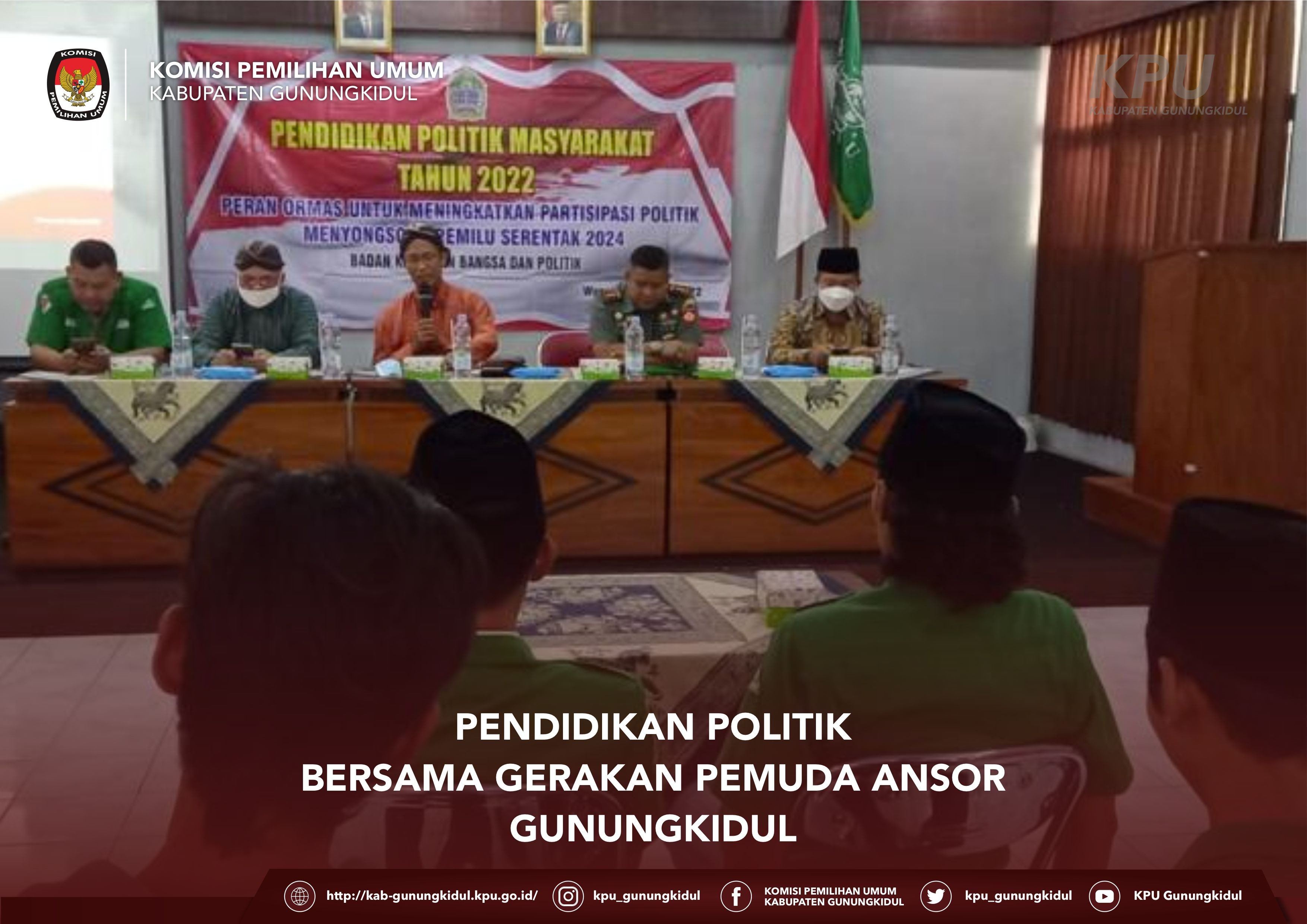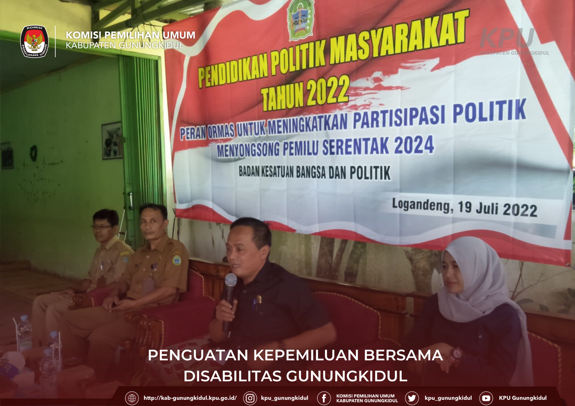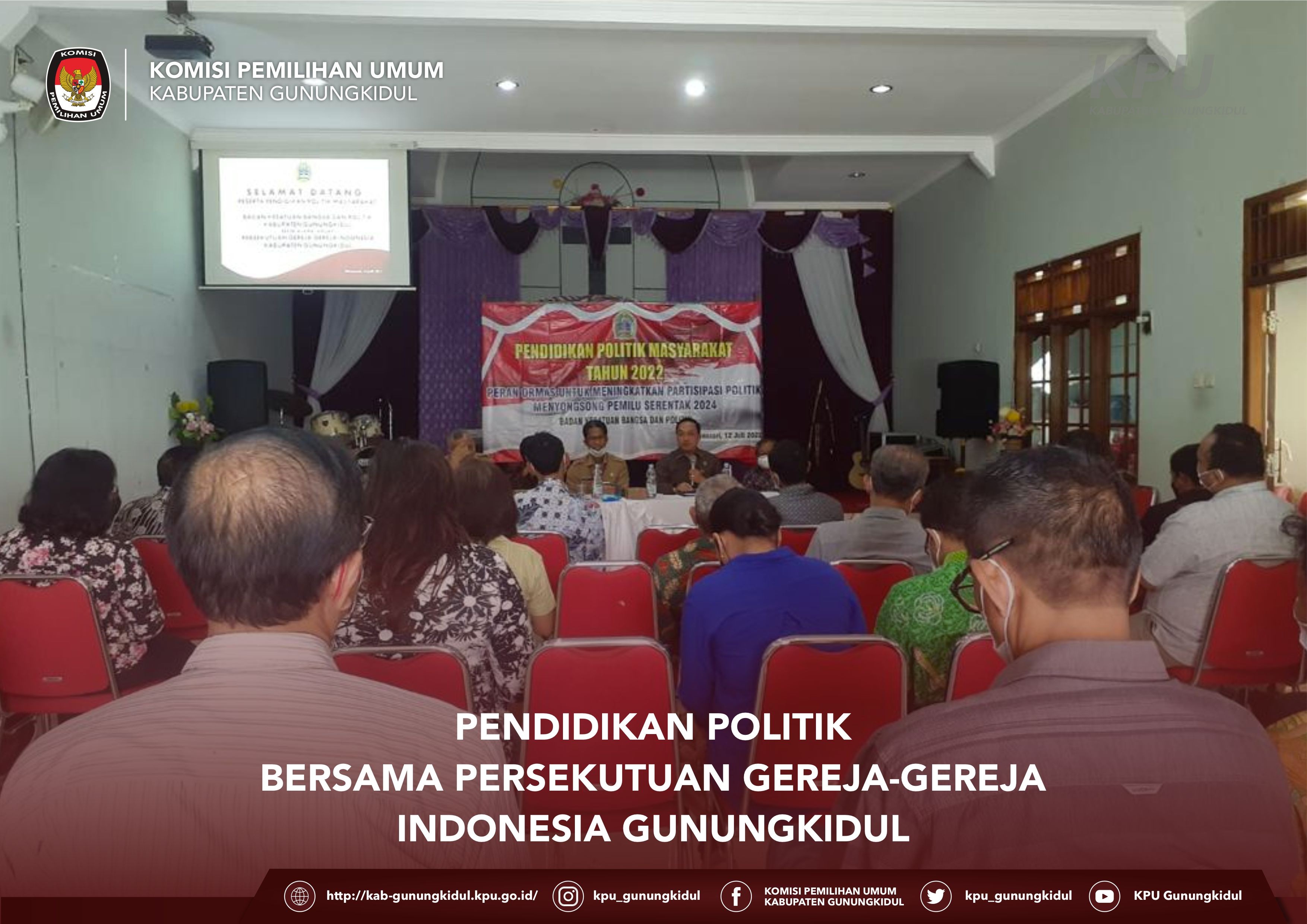 Wonosari (12/7), KPU Kabupaten Gunungkidul hadir dalam acara kegiatan pendidikan politik berbasis organisasi kemasyarakatan yang diadakan oleh Badan Kesatuan Bangsa dan Politik Kabupaten Gunungkidul bersama Persekutuan Gereja - Gereja Indonesia (PGI) Gunungkidul yang diadakan oleh Badan Kesatuan Bangsa dan Politik Kabupaten Gunungkidul. Hadir dalam acara tersebut Ketua Divisi Hukum dan Pengawasan KPU Kabupaten Gunungkidul Rohmad Qomarudin S.Pd.I selaku narasumber. Ketua Pengadilan Negeri Wonosari Tri Joko Pamungkas, SH., MH, Kepala Badan Kesatuan Bangsa dan Politik Kabupaten Gunungkidul Johan Eko Sudarto, S.Sos., MH juga turut hadir dalam kesempatan tersebut. Kegiatan yang bertempat di GSJA Raja Damai Wonosari ini diikuti oleh Organisasi keagamaan Persekutuan Gereja-Gereja Indonesi. Ke depan ormas diharapkan bersinergi untuk mensukseskan pemilu dengan menjaga situasi guyup rukun. Sementara itu dalam paparannya, Rohmad Qomarudin menjelaskan mengenai tahapan pemilu. Selanjutnya berharap kepada masyarakat kristiani yang mengikuti kegiatan pendidikan politik untuk menyebarluaskan informasi mengenai tahapan, jadwal dan program pemilu dan pemilihan, selain itu juga mendorong terwujudnya suasana yang kondusif bagi penyelenggara pemilu dan penyelenggaraan pemilihan yang aman, damai, tertib dan lancar.