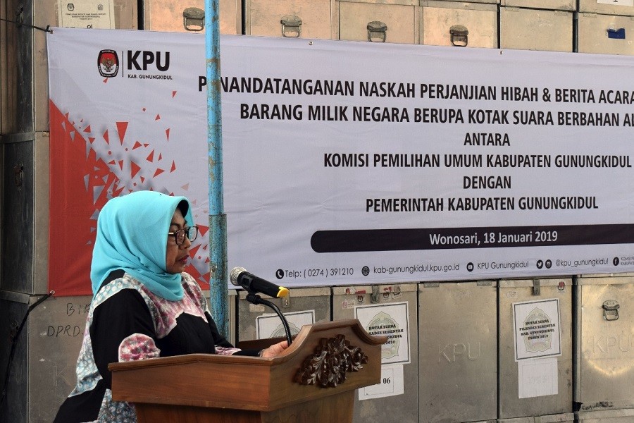 Pelaksanaan Penandatanganan Hibah Barang Milik Negara Berupa Kotak Suara Berbahan Alumunium sejumlah 1450 buah dari KPU Kabupaten Gunungkidul Kepada Pemerintah Kabupaten dilaksanakan Jum'at 18 Januari 2019 di Kantor KPU Gunungkidul. Naskah ditandatangani oleh Bupati Gunungkidul, Hj. Badingah, S. Sos dengan Sekretaris KPU, Drs. Budi Hartono, S.H.