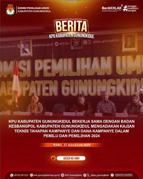 Selasa, (9/9/2025) KPU Kabupaten Gunungkidul bekerjasama dengan Badan Kesatuan Bangsa dan Politik (Kesbangpol) Kabupaten Gunungkidul mengadakan kegiatan Peningkatan Kapasitas Partai Politik melalui Kajian Teknis Penataan Daerah Pemilihan Pada Pemilu dan Pemilihan Tahun 2024. Hadir dalam kegiatan ini Ketua Divisi Teknis Penyelenggaraan KPU DIY, Bawaslu Kabupaten Gunungkidul, perwakilan dari Bagian Pemerintahan Sekretariat Daerah Kabupaten Gunungkidul, Dinas Kependudukan Dan Catatan Sipil Kabupaten Gunungkidul, Polres Gunungkidul, Kodim 0730 Gunungkidul, dan Universitas Gunungkidul (UGK), Perwakilan Media, dan LO/Penghubung Partai Politik se Kabupaten Gunungkidul. Salah satu bahasan dalam kajian ini adalah rencana pemecahan dapil di wilayah Gunungkidul untuk DPRD Provinsi sehingga di wilayah gunungkidul dibagi menjadi dua dapil, yaitu DIY 7 dan DIY 8. Dan dapil untuk DPRD Kabupaten yang pada 2024 ada 5 dapil direncanakan dipecah menjadi 6 dapil. Kajian ini menjadi forum diskusi interaktif dimana para peserta memberikan masukan dan saran terkait tahapan Penataan Daerah Pemilihan pada Pemilu dan Pemilihan Tahun 2024. Masukan tersebut dikumpulkan dan diteruskan ke KPU RI melalui KPU DIY sebagai bahan evaluasi dan masukan untuk membuat kebijakan yang lebih baik lagi. Diharapkan dalam Pemilu yang akan datang pelaksanaan penataan daerah pemilihan (dapil) di wilayah kabupaten Gunungkidul dapat berjalan lancar, transparan dan sesuai dengan regulasi yang berlaku.