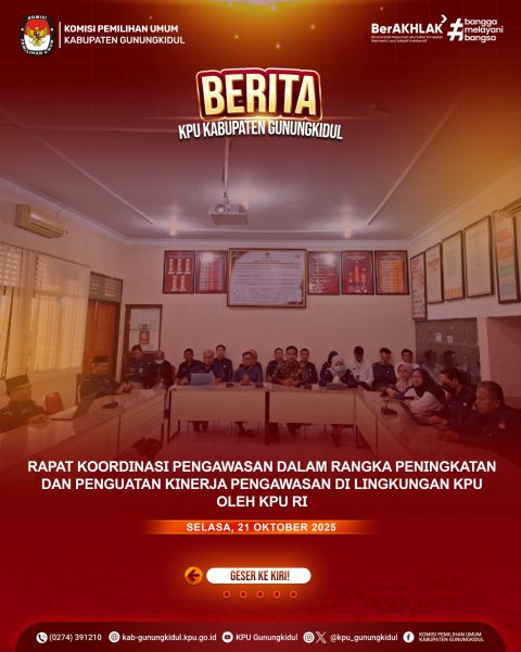 Rabu (29/10/2025), Komisi Pemilihan Umum (KPU) Kabupaten Gunungkidul mengikuti Rapat Koordinasi Tindak Lanjut Keputusan KPU Nomor 855 Tahun 2025 tentang Pedoman Teknis Penyelenggaraan Sistem Pengendalian Intern Pemerintah (SPIP) di lingkungan KPU, serta tindak lanjut Surat Dinas KPU Nomor 1766/PW.02-SD/11/2025 tanggal 17 Oktober 2025 perihal Langkah-Langkah Strategis dalam Rangka Percepatan Pelaksanaan Pembangunan Zona Integritas (ZI) pada satuan kerja KPU Provinsi/KIP Aceh dan KPU/KIP Kabupaten/Kota. Kegiatan ini diselenggarakan oleh KPU DIY secara daring. Rapat tersebut dihadiri oleh Ketua KPU Kabupaten Gunungkidul Asih Nuryanti, bersama jajaran komisioner yaitu Supami (Ketua Divisi Teknis Penyelenggaraan), Antok (Ketua Divisi Hukum dan Pengawasan), Sudarmanto (Ketua Divisi Partisipasi Masyarakat dan SDM), Irwan Budisusanto (Ketua Divisi Rendatin), Totok Singgih (Sekretaris), serta pejabat struktural, pejabat fungsional, dan perwakilan staf dari setiap divisi di lingkungan KPU Kabupaten Gunungkidul. Kegiatan ini merupakan tindak lanjut dari hasil Rapat Koordinasi Pengawasan yang bertujuan untuk meningkatkan dan memperkuat kinerja pengawasan di lingkungan KPU. Dalam rapat tersebut, KPU DIY memberikan gambaran umum mengenai pedoman teknis penyelenggaraan SPIP berdasarkan Keputusan Nomor 855 Tahun 2025, termasuk penjelasan mengenai perubahan dan penyempurnaan pedoman teknis dibandingkan ketentuan sebelumnya. Selain itu, KPU DIY juga memaparkan strategi percepatan pembangunan Zona Integritas (ZI) di satuan kerja KPU Kabupaten/Kota. Langkah tersebut diharapkan dapat memperkuat penerapan nilai-nilai integritas, akuntabilitas, dan transparansi dalam pelaksanaan tugas serta pelayanan publik di lingkungan KPU. Dengan adanya kegiatan ini, KPU Kabupaten Gunungkidul berkomitmen untuk meningkatkan efektivitas pengendalian intern dan mempercepat pembangunan Zona Integritas menuju terwujudnya KPU yang berintegritas dan terpercaya.