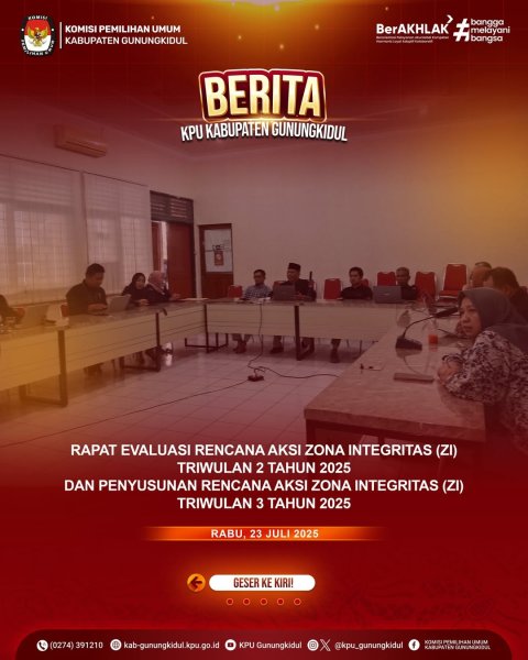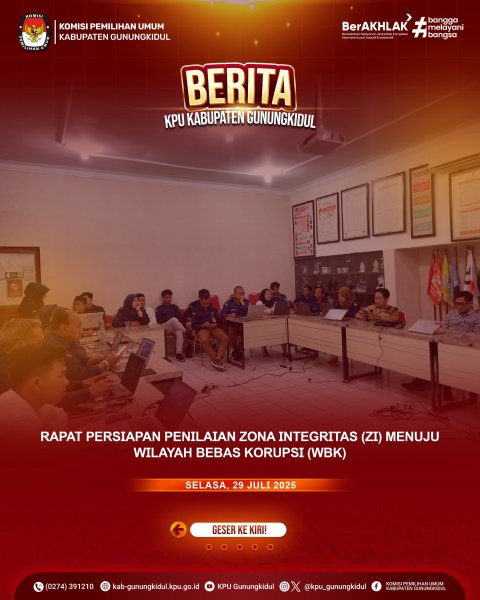 Selasa, (29/07/25) KPU Kabupaten Gunungkidul menggelar rapat persiapan penilaian Zona Integritas (ZI) Menuju Wilayah Bebas Korupsi (WBK) di ruang rapat KPU Gunungkidul. Rapat ini dihadiri oleh Ketua dan Anggota, Sekretaris, Pejabat fungsional, pejabat struktural, ASN dan Non ASN di lingkungan KPU Kabupaten Gunungkidul. Hal itu bertujuan untuk memastikan kesiapan KPU Gunungkidul dalam menghadapi penilaian Zona Integritas. Rapat tersebut membahas tentang strategi dan langkah-langkah yang perlu dilakukan dan disiapkan untuk meningkatkan nilai Zona Integritas KPU Kabupaten Gunungkidul. Selain itu, rapat juga membahas tentang pentingnya keterlibatan seluruh pegawai dalam pembangunan Zona Integritas. Dalam rapat tersebut, seluruh pegawai diberikan kesempatan untuk menyampaikan pendapatnya tentang persiapan penilaian Zona Integritas ini. “Zona Integritas bukan hanya tanggung jawab satu atau dua orang, tapi tanggung jawab kita semua” ujar Totok Singgih (Sekretaris KPU Kab. Gunungkidul) Dengan adanya rapat persiapan ini, KPU Kabupaten Gunungkidul berharap dapat meningkatkan kualitas pelayanan publik dan mewujudkan pemerintahan yang bersih dan transparan dan tentunya mendapat penilaian baik dalam Zona Integritas (ZI) menuju Wilayah Bebas Korupsi (WBK).