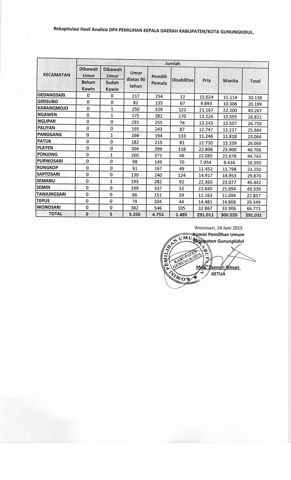 Wonosari (23/7), GKR Hemas melakukan kunjungan kerja sebagai Anggota DPD RI ke KPU Kabupaten Gunungkidul pada hari Kamis (23/7). Kunjungan kerja GKR Hemas didampingi oleh Sekretaris Daerah kabupaten Gunungkidul, Ir. Budi Martono, M.Si. Ketua dan Anggota KPU Gunungkidul beserta jajaran Sekretariat KPU Gunungkidul menerima kunjungan GKR Hemas di Ruang rapat KPU Gunungkidul. Maksud kunjungan Anggota DPD RI dari Daerah Istimewa Yogyakarta tersebut adalah untuk melihat sejauh mana kesiapan pelaksanaan Pemilihan Bupati dan Wakil Bupati di Kabupaten Gunungkidul. Dalam masa reses ini, Beliau menginginkan adanya masukan dari KPU Gunungkidul tentang pelaksanaan Pemilihan Bupati dan Wakil Bupati pada 9 Desember 2015 mendatang. Ketua KPU Gunungkidul, Moh. Zaenuri Ikhsan menyambut baik kunjungan ini dan menjelaskan tahapan Pemilihan Bupati dan Wakil Bupati yang telah dan sedang berjalan saat ini. Penjelasan tersebut antara lain tentang tahapan yang sedang berjalan saat ini, yaitu pemutakhiran data pemilih. Sedangkan tahapan yang akan segera dilaksanakan adalah pendaftaran pasangan calon Bupati dan wakil Bupati pada tanggal 26-28 Juli 2015. Kabupaten Gunungkidul merupakan satu-satunya Kabupaten di DIY yang mempunyai pasangan calon dari jalur perseorangan pada pemilihan Bupati dan Wakil Bupati tahun ini. Sedangkan untuk persoalan anggaran, NPHD telah ditandatangani dan sudah mulai dicairkan. Permohonan anggaran juga telah disetujui seratus persen oleh Pemerintah Kabupaten Gunungkidul. Tetapi setelah berjalannya tahapan, ada beberapa revisi yang telah dan akan dilakukan. Hal ini berkaitan dengan Peraturan dari Kementrian Dalam Negeri dan Kementrian Keuangan. Sehingga KPU Kabupaten Gunungkidul juga berkoordinasi dengan BPK yang telah masuk Ke KPU Kabupaten Gunungkidul. Menanggapi penjelasan Ketua KPU Gunungkidul, GKR Hemas mengingatkan untuk memperhatikan data pemilih. Khususnya para perantau yang tersebar di luar DIY. Perantau tersebutbanyak sekali jumlahnya dan masih ber-KTP Kabupaten Gunungkidul. Sosialisasi KPU hendaknya menjangkau para perantau tersebut. Kemudian berkaitan dengan anggaran, diharapkan Satker/SKPD untuk berhati-hati terhadap peraturan yang berlaku. Tetapi hal itu jangan sampai mengekang kreatifitas satker/SKPD dan takut dalam melaksanakan kegiatan. Apalagi bagi KPU Kabupaten Gunungkidul yang pada Pemilihan Bupati dan Wakil Bupati kali ini mempunyai cukup besar anggaran yang akan digunakan. GKR Hemas juga mengapresiasi kerjasama yang telah dibangun dengan BPK dalam rangka pendampingan selama ini. Pada akhirnya GKR Hemas mengharapkan pelaksanaan Pemilihan Bupati dan Wakil Bupati di Kabupaten Gunungkidul berjalan lancar dan sukses.