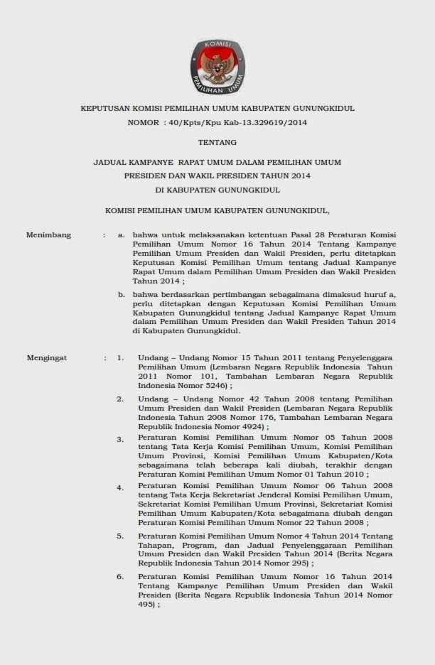 SK No.40/Kpts/Kpu Kab-13.329619/2014 KPU Gunungkidul tentang Jadwal Kampanye Rapat Umum dalam Pemilihan Umum Presiden dan Wakil Presiden tahun 2014 di Kabupaten Gunungkidul