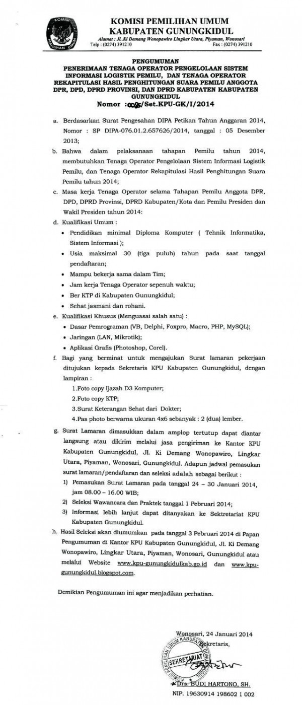 Informasi lebih lanjut dapat menghubungi panitia lelang KPU Kabupaten Gunungkidul, Jl. Ki Demang Wonopawiro, Piyaman, Wonosari, Gunungkidul, Telp. (0274) 391210 atau melalui KPKNL Yogyakarta Jl. Kusumanegara No.11 Telp. (0274) 544091.