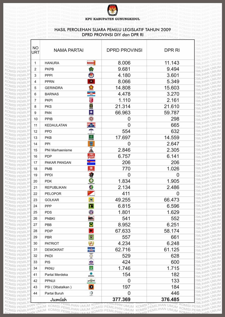 PEMILUKADA KABUPATEN GUNUNGKIDUL TAHUN 2010 Tahapan, Program dan Jadwal Persiapan » No Tahapan Jadwal a. Penyusunan Program dan Anggaran 1 Agust s.d 31 Des 2009 b. Penetapan Keputusan KPU Kabupaten 17 Sep s.d 23 Okt 2009 c. Tahapan Pelaksanaan Peraturan 1 Okt s.d 23 Des 2009 d. Pembentukan dan Pelantikan PPK, PPS dan PPDP 10 Nov 2009 s.d 10 Jan 2010 e. Pembentukan Panwaslu Kabupaten dan Kecamatan 26 Okt 2009 s.d 23 Nov 2010 f. Pendaftaran Pemantau Pemilukada 23 Nov 2009 g. Sosialisasi Informasi dan Pendidikan Pemilih 23 Nov 2009 h. Pemberitahuan DPRD Kab ke Bupati mengenai berakhirnya masa jabatan Kepala Daerah 27 Februari 2010 i. Rapat Koordinasi 23 Des 2009 s.d 27 Juli Pelaksanaan » No Tahapan Jadwal a. Pemutakhiran Data dan Pendaftaran Pemilih 23 Nov 2009 s.d 23 Feb 2010 b. Pendaftaran Pasangan Calon 6 Jan 2010 s.d 24 Maret 2010 c. Pencetakan dan Pendistribusian Logistik 5 Feb 2010 s.d 22 Mei 2010 d. Kampanye 6 s.d 20 April 2010 e. Pemungutan dan Penghitungan Suara 23 April 2010 s.d 2 Juni 2010 Penyelesaian » No Tahapan Jadwal a. Penyampaian Gugatan 3 s.d 5 Juni 2010 b. Penyelesaian Sengketa Hukum 6 s.d 19 Juni 2010 c. Penyampaian Hasil Pemilu 6 s.d 22 Juni 2010 d. Pelantikan dan Pengucapan Sumpah/Janji Calon Terpilih 27 Juli 2010 e. Laporan Hasil Pemilukada kepada KPU dan KPU Provinsi DIY 5 s.d 23 Juni 2010 f. Pemelihaan Arsip & Dokumen 5 s.d 23 Juni 2010 g. Pembubaran PPK dan PPS 1 s.d 30 Juli 2010 h. Evaluasi dan Pelaporan Pemilukada 24 Mei s.d 23 Juli 2010 i. Pertanggungjawaban Anggaran 24 Mei s.d 23 Agustus 2010 Hasil Rekapitulasi » Rapat Pleno Rekapitulasi Penghitungan Suara Pasangan Calon Kepala Daerah dan Wakil Kepala Daerah Kabupaten Gunungkidul Tahun 2010 di tingkat KPU Kabupaten dilaksanakan pada hari Sabtu, tanggal 29 Mei 2010 pukul 14:00 s/d 15:00. Hasil rekapitulasi penghitungan suara tingkat kabupaten adalah sebagai berikut : Prosentase perolehan suara tingkat kabupaten adalah sebagai berikut : Prosentase jumlah suara sah dan tidak sah adalah sebagai berikut : Calon Terpilih » Rapat Pleno Penetapan Calon Terpilih Pemilu Kepala Daerah dan Wakil Kepala Daerah Kabupaten Gunungkidul Tahun 2010 dilaksanakan pada hari Sabtu, tanggal 29 Mei 2010 pukul 14:00 s/d 15:00. Hasil Perolehan Suara Pasangan calon Kepala Daerah dan Wakil Kepala Daerah sebagaimana dimaksud dalam DIKTUM KESATU adalah sebagai berikut : 1. H. SUHARTO,SH dan H. ARIEF GUNADI, S.Ag.M.PdI Suara Sah : 129.841, atau 31,86 % 2. H. SUTRISNO, SE dan SLAMET, S.Pd, MM Suara Sah : 119.778, atau 29,39 % 3. Prof.Dr.Ir.H. SUMPENO PUTRO,M.Sc dan Hj. BADINGAH, S.Sos Suara Sah : 146.849 (seratus empat puluh enam ribu delapan ratus empat puluh sembilan), atau 36,03 % (tiga puluh enam koma nol tiga persen) 4. H. YANTO, SH dan NGADIYONO Suara Sah : 11.103 , atau 2,72 % Dengan demikian maka Calon Terpilih dalam Pemilihan Umum Kepala Daerah dan Wakil Kepala Daerah Kabupaten Gunungkidul Tahun 2010 adalah : NO Urut 3 : Prof.Dr.Ir.H. SUMPENO PUTRO,M.Sc dan Hj. BADINGAH, S.Sos Dengan memperoleh dengan perolehan suara sah : 146.849 , atau 36,03 %
