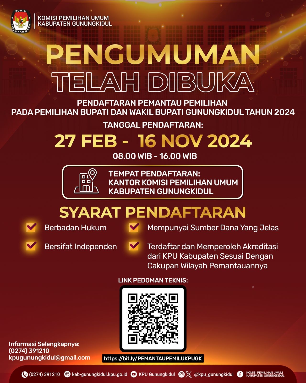 Komisi Pemilihan Umum (KPU) Kabupaten Gunungkidul melalui Kantor Pelayanan Kekayaan Negara dan Lelang (KPKNL) Yogyakarta akan melaksanakan penjualan di depan umum/lelang terhadap Barang Milik Negara. Penawaran dilakukan secara tertutup (open bidding) pada alamat domain www.lelang.go.id terhadap barang bergerak berupa satu (1) paket barang inventaris kantor (Tenda Stand, Televisi, Camera, PC Unit, Laptop, External Hardisk, dan UPS) dalam kondisi apa adanya dengan nilai limit Rp. 812.000,00 (delapan ratus dua belas ribu rupiah).